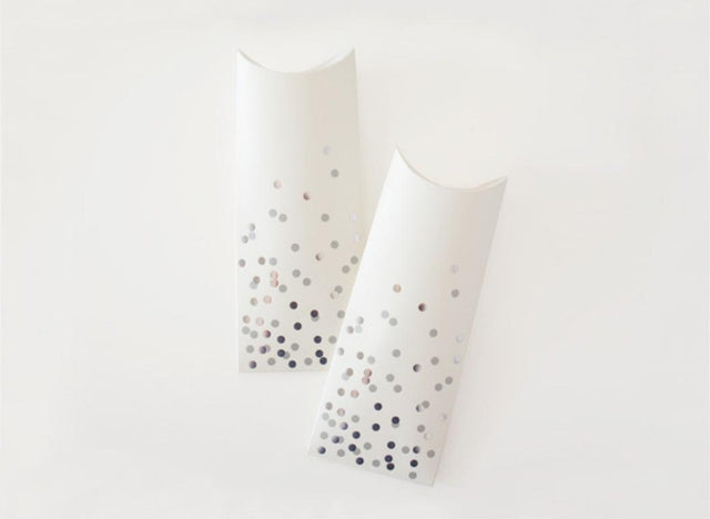 These gorgeous premium pillow boxes feature a stylish silver confetti metallic print. They are perfect for wedding favours and candy bars.