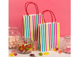 The retro-look paper bags feature vibrant vertical stripes and red twisted paper handles.