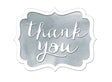 Made of plastic, these thank you stickers are metallic silver and feature a scroll shape, white border and white "Thank You" headline in elegant script.
