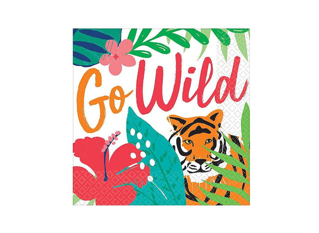 Go wild with your tropical jungle tableware! These colourful beverage napkins feature a tiger and "Go Wild" headline.