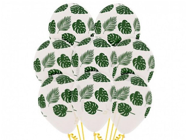 Decorate your tropical or jungle themed party with these white balloons printed all over with green monstera and palm leaf print.