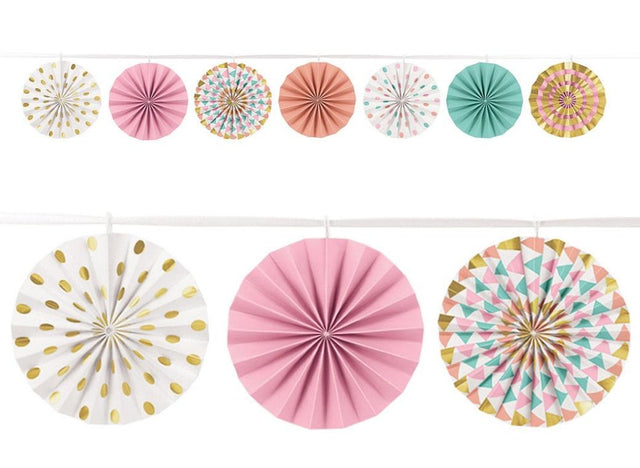 Garland features 7 paper fans in mint, pink and peach with gold foil, and assorted designs.