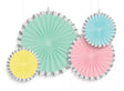 Set of 4 fans in mint green, pastel blue, pink, and yellow, all with metallic silver edging.