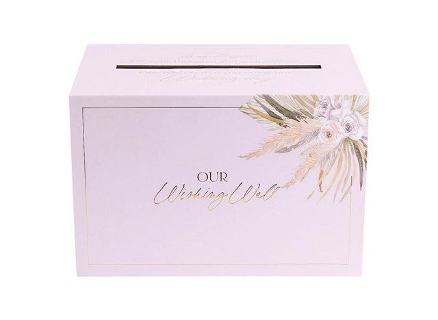 Perfect for collecting gifts, cards, and heartfelt messages, this stylish blush pink box features luxe gold foil details and a delicate floral design.