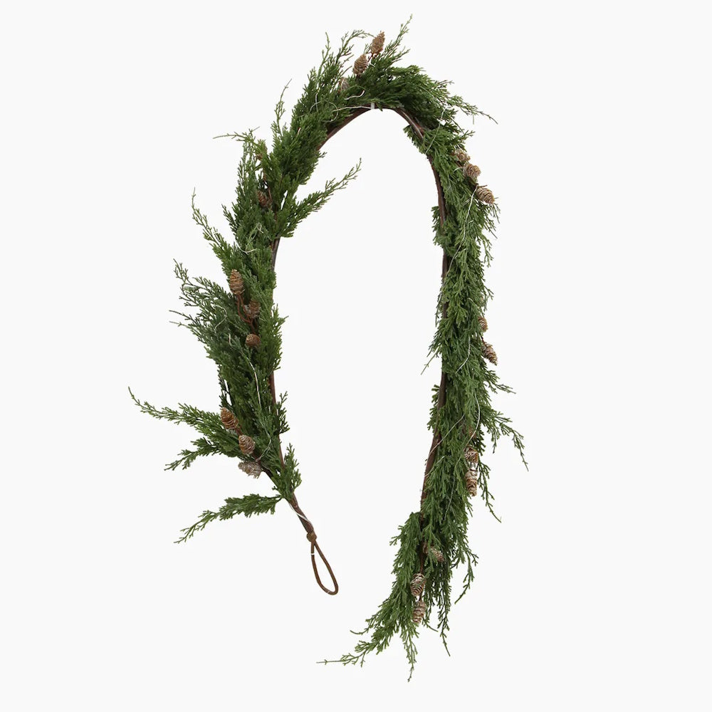 This Cedar & Pinecone Swag with Lights combines lush cedar foliage, pinecones, and a subtle string of lights for a festive glow.
