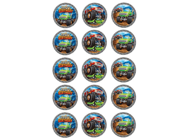 Each pack contains 15 x 5cm round cupcake images featuring Monster Truck images. Ice your cupcakes or cookies, then simply place the image on top.