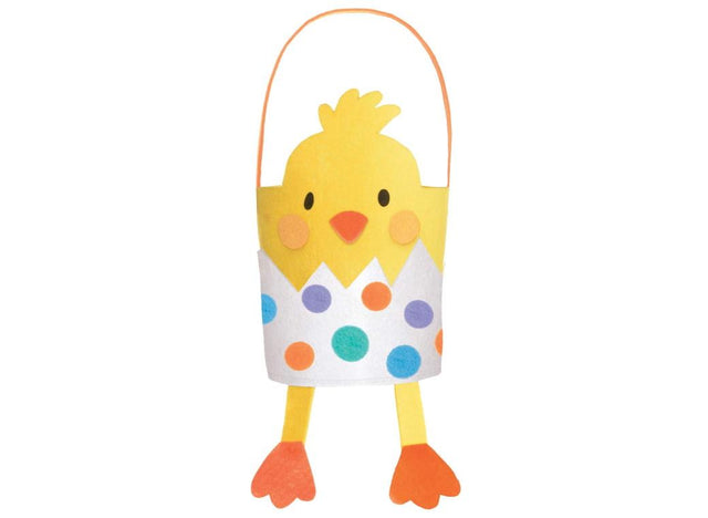 This delightful felt basket has a yellow chick behind "cracked" egg covered in colourful polka dots. When the basket is carried around, cute yellow and orange legs hang below.
