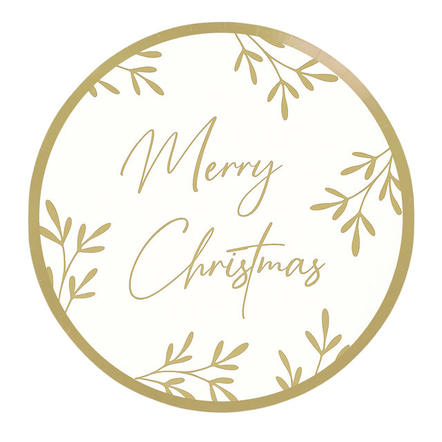 Featuring a "Merry Christmas" headline and botanical motifs in satin gold print, these plates add warmth and sophistication to any Christmas celebration.