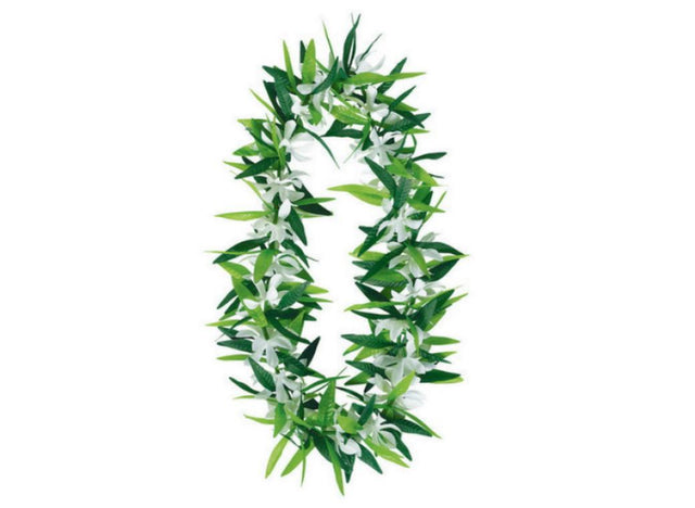 This Flower & Leaf Maile Lei features long, thin green fabric leaves in between pretty white flowers - the "lei of royalty" in Hawaii.