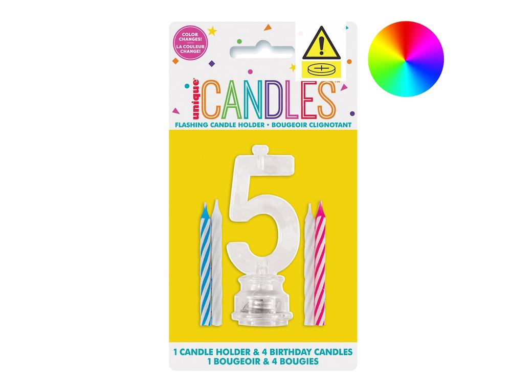 Illuminate your celebration with this fun number 5-shaped LED candle! It flashes and changes colours, adding a vibrant and dynamic touch to your birthday cake.
