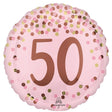 Decorate your 50th birthday celebration with this pretty pink foil balloon featuring a pink, rose gold and gold confetti design.