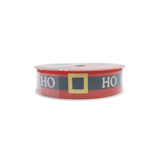 Red satin ribbon with Santa's black belt, with the text "HO HO HO" between each golden buckle design.