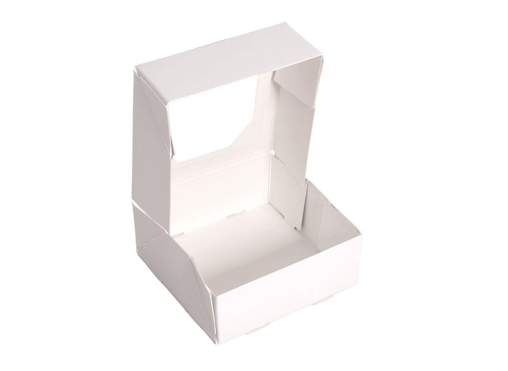 Pack of 5 white cardboard boxes, with hinged lid and clear window.