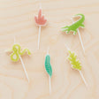 Decorate your jungle cake with this set of shaped candles that includes crocodile, snake, cactus and two leaves.