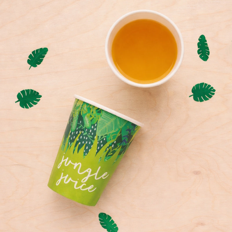 Featuring a vibrant jungle leaf design with playful “jungle juice” script, these cups are perfect for little explorers celebrating a safari or jungle-themed birthday.