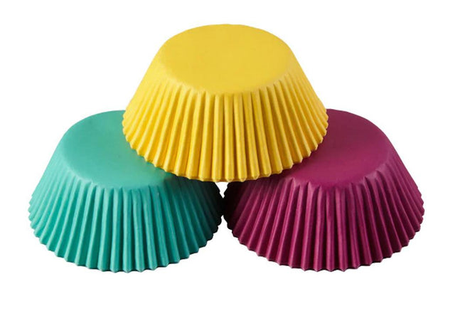 Pack of 75 cupcake cases in 3 vibrant jewel tones: teal, bright yellow and fuchsia (approx 25 of each). Great to have in the pantry.