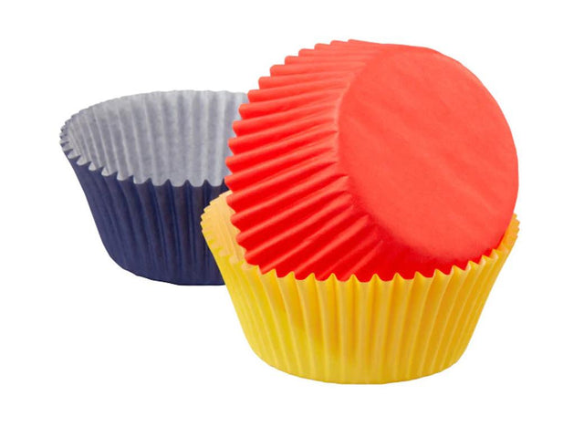 Pack of 75 cupcake cases in 3 primary colours: red, yellow and blue (approx 25 of each)