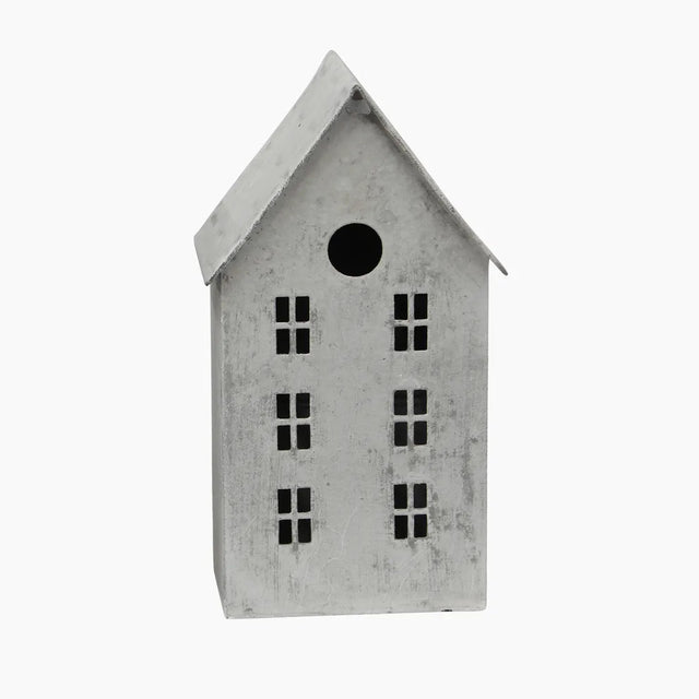 This Tall Zinc Tealight House adds a warm glow to your Christmas display with a light grey modern-Scandi charm.